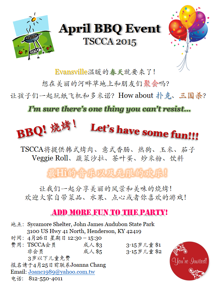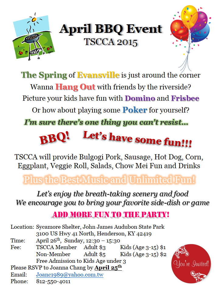 April BBQ Event - 12:30 p.m. to 3:30 p.m., Sunday, April 26, 2015, at Sycamore Shelter, John James Audubon State Park, 3100 US Hwy 41 North, Henderson, KY 42419 (Flyer 1) (Flyer 2)